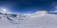 Panoramic view of skiers enjoying the winter slopes of the French Alps. The clear sky contrasts with the snow-covered mountains and glacial cliffs. A popular tourist attraction in Europe for skiing and experiencing the natural beauty of the mountain range.