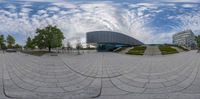a fisheye view of the entrance to an office building with a sky background and several clouds