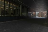 A modern and sleek office building in the heart of Toronto's business district. The city lights illuminate the dark night, highlighting the sleek architecture and urban design. The concrete flooring and tiled entryway create a stylish and professional atmosphere.