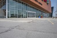 A modern office building and storefronts in the business district of Toronto, Ontario, Canada. The clear sky highlights the sleek architecture and clean lines. The urban landscape features roads, parking, and transportation options.