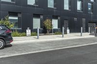 Modern architecture in Toronto's business district. Sleek black building with parking lot and meter sign. Cars parked near the office building, embodying city life and urban design.