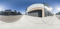 A modern office building in Toronto, Canada, captured in a fisheye photo. The sun casts hard shadows on the building's sleek facade, creating a striking contrast. The urban design and clear sky add to the city's vibrant atmosphere.