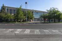 an empty parking lot with some buildings in the background of the photo, with trees and bushes in front