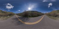 Snow-covered asphalt road in Colorado, with the sun breaking through the clouds casting hard shadows. A picturesque USA landscape at dawn, embracing the beauty of nature and open spaces.