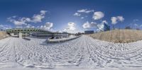 the view of the snow and city from outside the gate of the tunnel, as seen from this fish eye lens