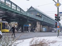 Snow covers the city of Berlin, Germany, creating a picturesque winter scene. The architecture of the city's buildings is highlighted against the grey sky. Urban design and infrastructure, including roads, bridges, and train tracks, are showcased. A beautiful mix of history and modernity.