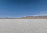 lone motorbike on a snow covered desert surface near mountains and sky line in distance