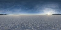 a large snow covered field filled with lots of ice and water on top of a clear sky