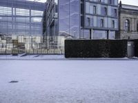 This stock photo features a large building, resembling a library or a science club, with a facade covered in snow. The city setting, visible through the windows, shows a combination of snow-covered ground, asphalt roads, and patches of grass. The urban design elements, including the composite material flooring and tints and shades of the building, create a visually appealing scene. The freezing weather adds to the charm of this winter cityscape.