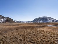 This is an image of a winter landscape in Yunnan, China. The snow-covered mountain peaks in the distance provide a stunning backdrop for the open plains and fields. The clear sky above contrasts with the peacefulness of the lake in the foreground. The grassy surface and gravel paths showcase the natural environment of this highland region of Asia. This photo captures the beauty of Shangri-La, with its wild and untouched wilderness. It represents a typical winter day in Yunnan, China.