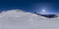 A snow-covered mountain road in the French Alps, offering a stunning view of the surrounding landscape. The sun shines brightly, illuminating the white terrain and casting long shadows. Tracks and ski slopes crisscross the mountain, making it a popular tourist attraction in winter.