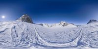 A breathtaking view of snow-covered mountains in the Alps. The open space and clear sky create a serene atmosphere. Ski tracks adorn the pristine snow, inviting tourists to explore the slopes. A perfect winter day in Italy and France.