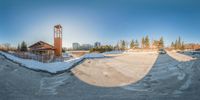 the camera is taking a photo of a snow covered park area with benches and a tower
