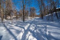 This is an image of a snowy road in rural Ontario, Canada. The clear sky overhead adds to the serene winter scene. The road stretches straight ahead, leading to a cottage hidden in the woods. The snow-covered ground and trees create a peaceful and picturesque landscape. It's a perfect day in Ontario to take a drive and enjoy the beauty of winter. This photo captures the tranquility of the snowy countryside outside of Toronto.