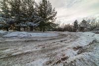 A snow-covered road in a suburban neighborhood in Toronto, Canada. Trees line the sides of the road as dawn breaks, casting a soft light on the scene. The quiet calm of a winter morning.