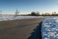 the long road runs along both sides of the snow covered field with no people on it