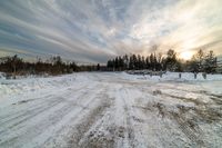a snow covered rural road is empty during the day time sunshine or sunset, with trees on either side