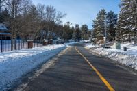 A snow-covered road in a suburban area of Ontario, Canada. The straight road extends into the distance, lined with trees and homes. Cloudy day adds to the peaceful atmosphere of the residential neighborhood.