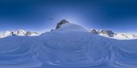 A breathtaking view of snow-covered mountains in the Alps, with skiers enjoying the winter slopes. The clear sky and sunshine create a stunning atmosphere. The majestic mountain range in Italy and France is a popular tourist attraction for skiing and recreation.