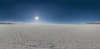 A snowboarder glides down a large snowy hill in the Utah desert, with the majestic mountains and clear blue sky in the background. The sun shines brightly, creating a perfect sunny day.