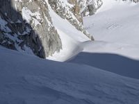 someone is snow skiing down a mountain in the snow near the mountains and a person is climbing