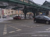 cars passing under a bridge in a city on a snowy day to see it snowing