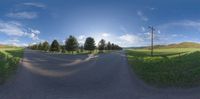 A snowy Colorado landscape at dawn, with the sun visible casting hard shadows on the open space. Clouds scatter in the sky as the road reflects the early morning sun.