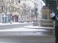 A man stands on the side of the road under a bridge in Berlin, Germany. Snow covers the city, contrasting with the grey sky. The urban design features a tree-lined thoroughfare and buildings with windows.