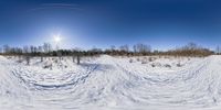 Snow-covered hill in Ontario, with tracks leading towards a distant horizon. Sunlight shines through the trees, creating a picturesque winter landscape. Azure sky contrasts with the freezing temperatures. A serene scene in Toronto's natural environment.