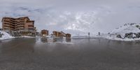 A snowy road winding through a picturesque alpine village in the French Alps. Charming buildings line the road, with a backdrop of majestic mountains. A popular tourist attraction in Europe during the winter season.