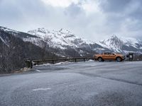 an orange truck is driving down a snowy road with mountains behind it and snow - capped rocks