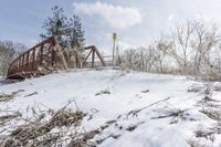 This is an image of a winter day in Ontario, Canada. The photo shows a road surrounded by residential houses and vegetation covered in snow. In the distance, there is a bridge and a clear sky with clouds. The snow-covered ground and trees create a peaceful rural landscape. The freezing temperatures have caused ice to form on the road and Armco barriers can be seen along the side. This photo represents the beauty and tranquility of winter in a suburban area of Ontario, Canada.