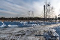This photo captures a sunny winter day in a suburban area of Toronto, Canada. Along a snow-covered road, small mounds of snow create a picturesque scene. The trees and a streetlight stand tall in the background, covered in snow. The sun is visible, casting a warm glow on the snow piles. This image showcases the beauty of winter in a residential neighborhood. It represents a peaceful and serene dawn in the suburbs of Toronto.