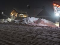 A snowy road at night in a mountainous residential area. The twinkling lights from shops and restaurants create a magical atmosphere. The Alps, a popular tourist attraction in France, covered in snow.