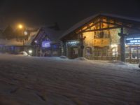 This is an image of a residential area in the Alps, France. It is nighttime and the snow-covered road leads to a charming lodge with lights glowing through the windows. The surrounding buildings and houses are covered in a blanket of snow, creating a cozy winter atmosphere. Above, the clear night sky is adorned with clouds. The Alps is a popular tourist attraction, especially during the winter season, offering opportunities for skiing and other winter activities. This photo captures the magic of a snowy evening in the Alps.
