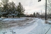 a snowy road next to some trees and a street light on top of it near some snowy ground