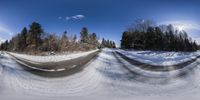 A snow-covered road winds through the picturesque Ontario landscape, surrounded by dense forests and evergreen trees. The bright sunlight casts long shadows on the road, creating a stunning winter scene.