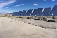 solar panels are seen on a dirt lot, while clouds float in the sky above