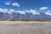 A scenic landscape of Spain, showcasing a solar plant with rows of solar panels on a sloping road. Clear skies and cumulus clouds add to the picturesque view. Harnessing solar energy to generate electricity in Europe.