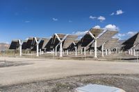 A group of large solar panels are shown in the background at the bottom of an open field. This solar plant is located in Tabernas, Spain, a beautiful landscape in Europe. The panels are placed on an asphalt road surrounded by desert vegetation. The house and rock formations can be seen in the distance. It is a sunny day with clouds in the sky. The solar panels are made of composite material and placed on the roof of the solar plant. The landscape includes a plateau with a slope, showcasing the engineering of this renewable energy fixture. In the air, contrails can be seen. The soil and land lot complete the scene of this chemical compound of energy production.