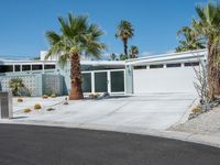 This image showcases a beautiful residential property in Palm Springs, California. The modern architecture of the home stands out against the clear sky and the lush greenery of the surrounding trees. The sleek facade and spacious driveway lead to the entryway and the garage door. The property is located in a peaceful suburban area, making it an ideal place to call home. This photo captures the essence of Palm Springs' mid-century charm and highlights the desirable real estate in the Sonora Desert.