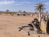 A serene desert landscape in South Africa. An abandoned car and truck sit among the vast expanse, with an old-style plant growing out of the back. Clear skies and sparse vegetation add to the rural charm.