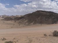 Endless road winding through the desert landscape in South Africa. Clear skies and elevated terrain provide a stunning view of the endless sand dunes. Telephone lines and a signpost add a touch of civilization to the wilderness.