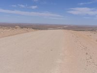 Endless road stretching across the arid landscape of South Africa. The brown sandy terrain contrasts with the clear blue sky. Sparse vegetation and gravel road surface add to the sense of remoteness and wilderness.