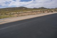 a view of a road going through the desert, with a person on a motorcycle near by