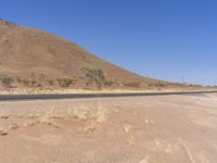 An endless road stretches through the African desert landscape, surrounded by majestic mountains and vast plains. The clear sky and endless horizon create a sense of freedom and adventure.