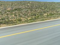 A person on a motorcycle traveling down an asphalt road in South Africa. The road cuts through a desert landscape, surrounded by fields and vegetation. Clear sky above adds to the picturesque scenery.