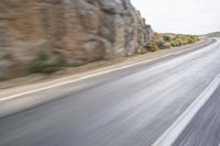 Endless road stretching through the African landscape. Grey asphalt and concrete blend with the rocky terrain and desert vegetation. Motion blur adds a sense of speed and adventure to this South African journey.