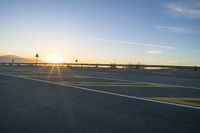 This is a beautiful landscape photo taken during the dawn in South Africa. The image features a long asphalt road surrounded by a vast plain and lush nature. The sunlight creates a stunning afterglow on the horizon, and the clear sky and visible sun add to the sunny atmosphere. A motion blur effect is captured as an automobile passes by, adding a sense of movement. The road surface is accompanied by a guard rail and Armco barriers for safety. This photo perfectly represents the beauty and tranquility of a South African sunrise.
