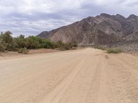 An endless road in the South African desert, surrounded by a barren landscape. The dirt and gravel surface blends with the mountains and vegetation. Clouds hover above, adding drama to the scene.